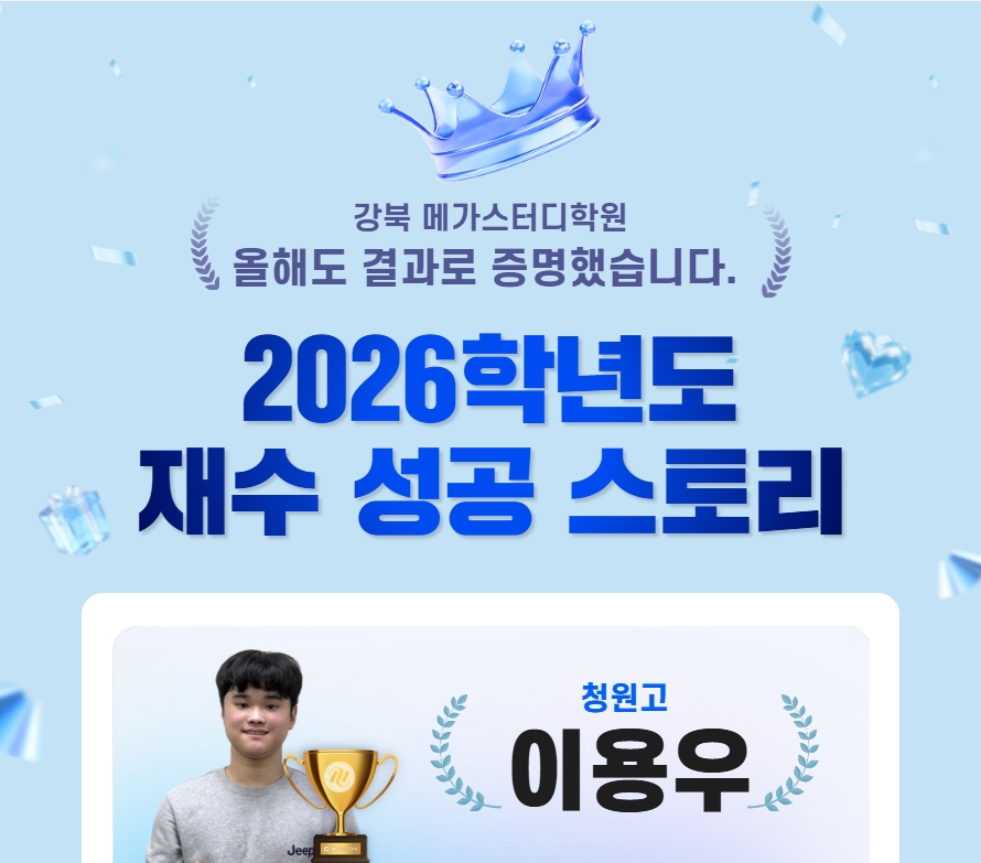 | 19 | Àç¼öÁ¾ÇÕ¹Ý | [ÇÕ°Ý ÀÎÅͺä] 2026Çг⵵ Àç¼ö ¼º°ø ½ºÅ丮(Á¤½Ã) - ÀÌ¿ë¿ì Çлý | 2026-03-10 | 31 |
