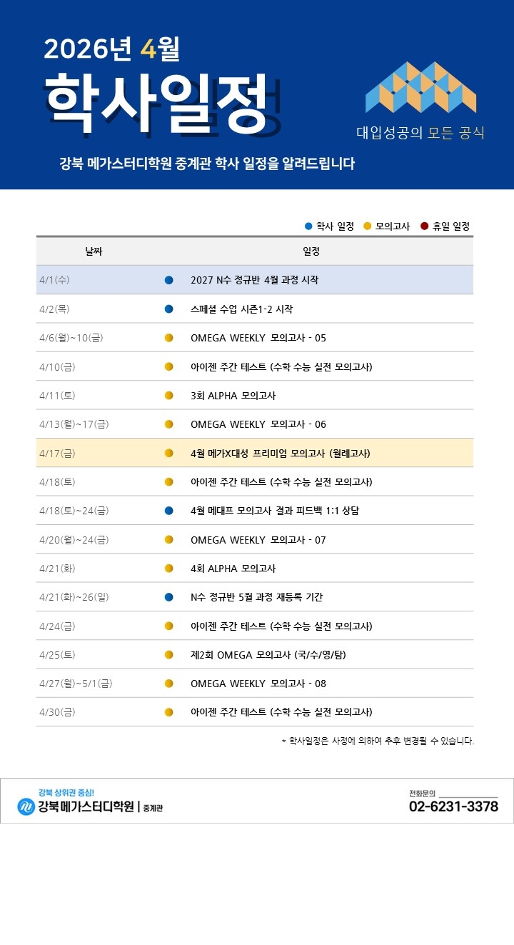 | hot | Àç¼öÁ¾ÇÕ¹Ý | [ÀÏÁ¤] 2026 4¿ù ÇлçÀÏÁ¤ ¾È³»new | 2026-03-28 | 66 |