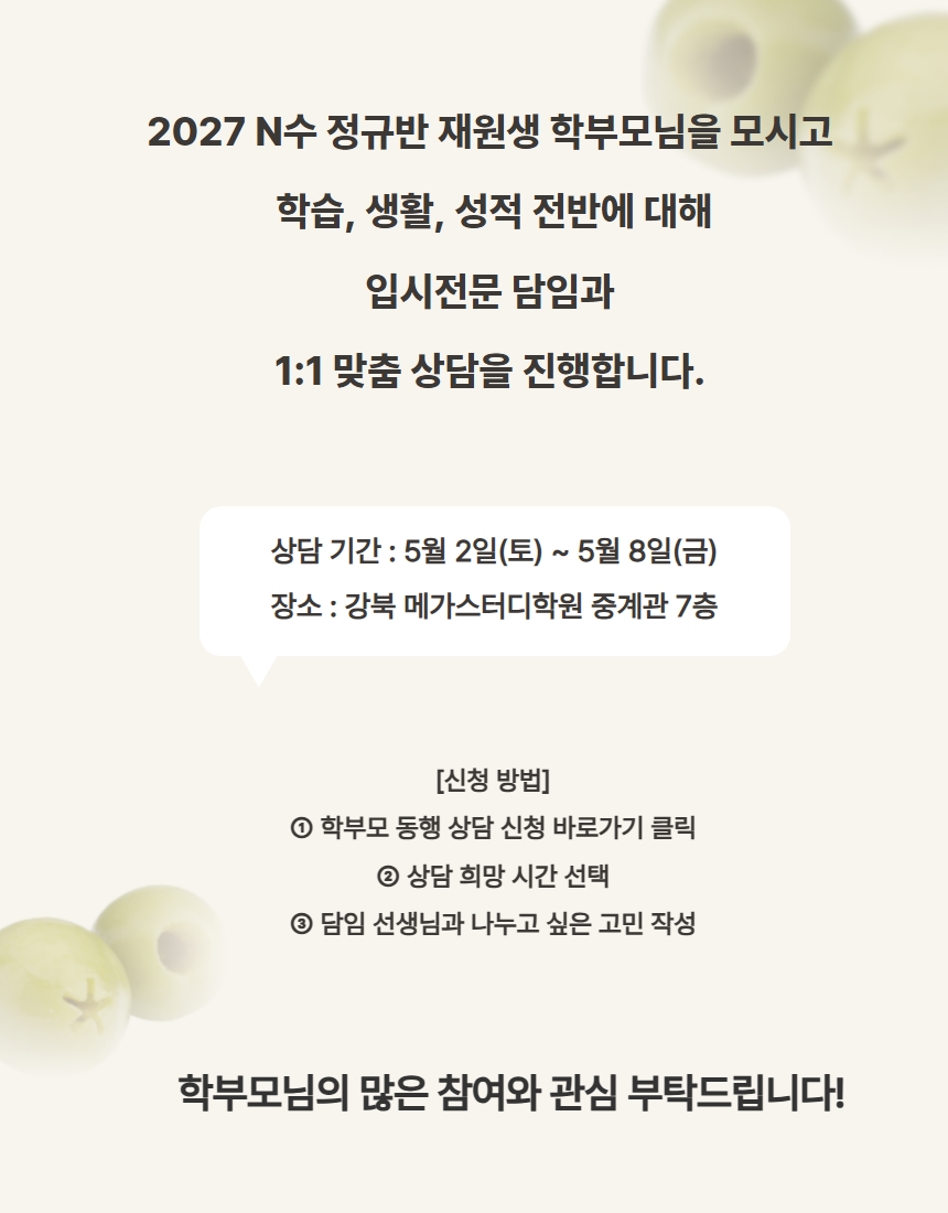 | 11 | Àç¼öÁ¾ÇÕ¹Ý | [¾È³»] 2027 N¼ö ¿ì¼±¹Ý µî¿ø ¾È³» | 2026-01-02 | 201 |