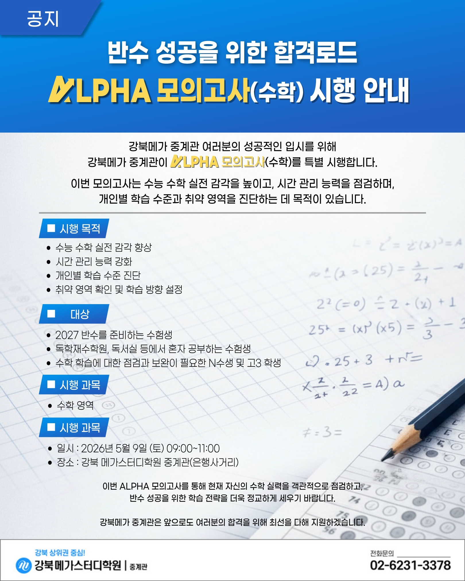 | 27 | Àç¼öÁ¾ÇÕ¹Ý | ALPHA ¸ðÀǰí»ç(¼öÇÐ) ½ÃÇà ¾È³»new | 2026-04-20 | 35 |